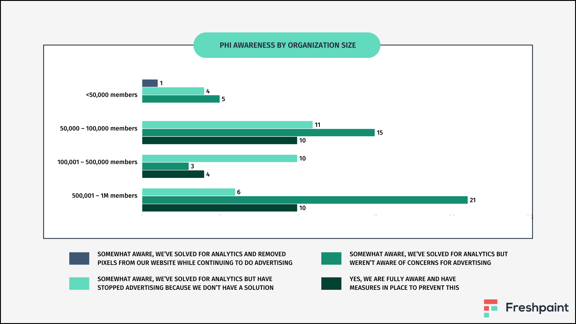 In contrast, larger organizations are more focused on ad targeting limitations (18.9%), highlighting concerns about avoiding the misuse of PHI in advertising. This contrast suggests that smaller organizations are grappling with foundational data privacy issues, while larger ones are navigating more advanced marketing and compliance complexities.