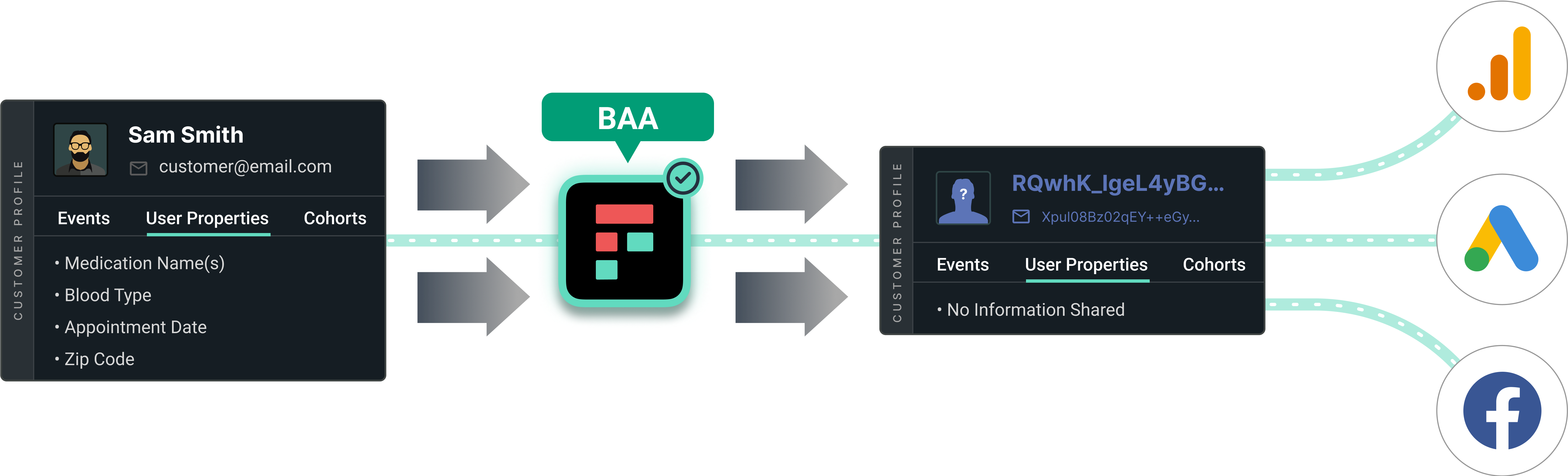 A BAA is a must-have component of a Healthcare Privacy Platform, but it's not enough. That's because while the BAA makes sure a platform can safely collect and store data, it does not make you safe when sharing your data with tools that are not HIPAA-compliant. You'll need a lot more to make tools like Google Analytics and ad platforms that are not HIPAA-compliant safe.