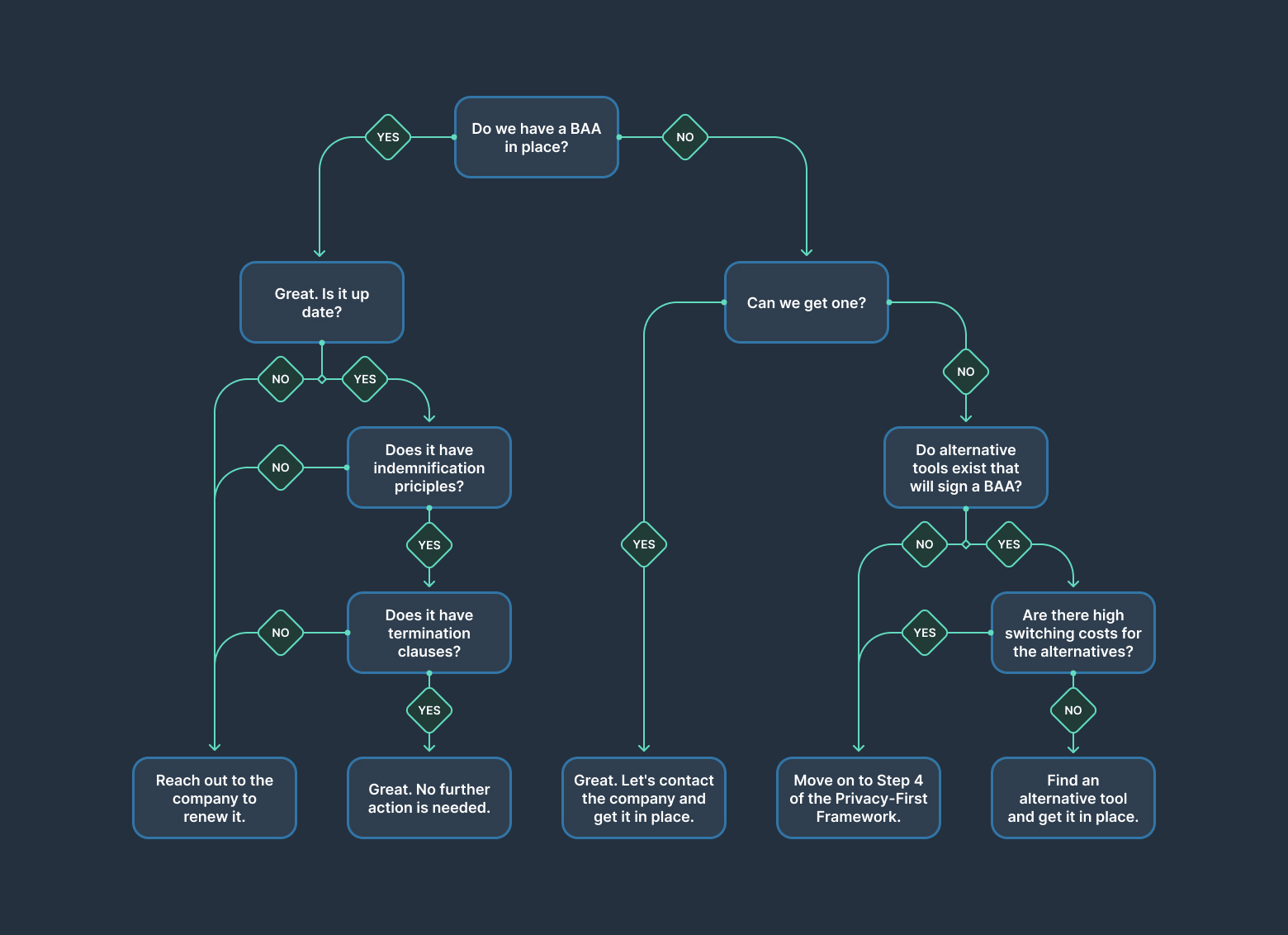If the company won’t sign a BAA, you need to either find an alternative tool or move on to step 4 of the Privacy-First Framework.