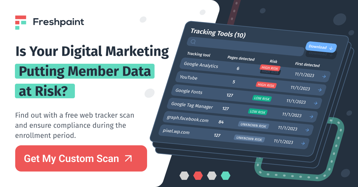 Freshpaint is a healthcare-specific Customer Data Platform that enables organizations to run data-driven digital marketing programs while maintaining HIPAA compliance. Freshpaint removes risky third-party tracking code and replaces it with a single, HIPAA-compliant tracking pixel, allowing healthcare marketers to send all the data they want–and none that they don't–to platforms like Google Analytics and Meta in just a few clicks. The platform also provides organizations with website monitoring that keeps teams informed on the risk of trackers as regulations and trackers change.