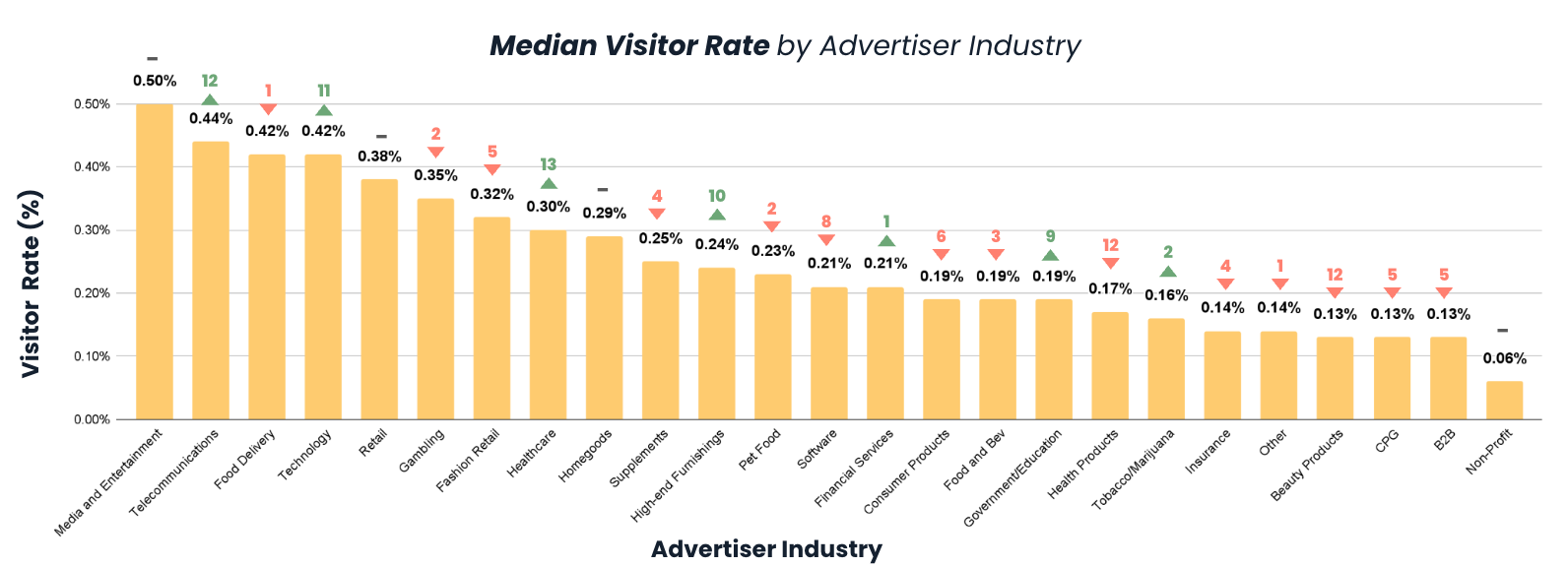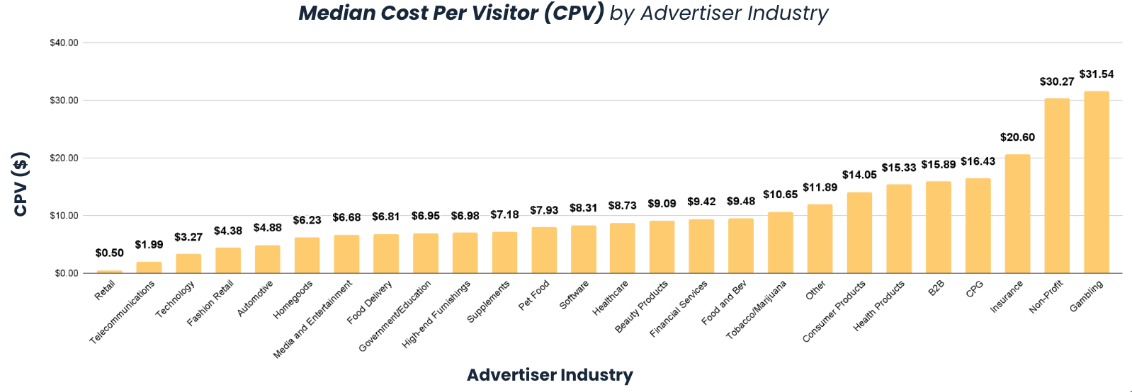 Healthcare advertisers see moderate acquisition and visitor costs paired with above-average engagement, but face a challenge in closing the loop on conversions. The high visitor rate suggests audiences are curious and willing to explore healthcare offerings, but the slightly lower conversion rate signals a need to refine the post-click experience.
