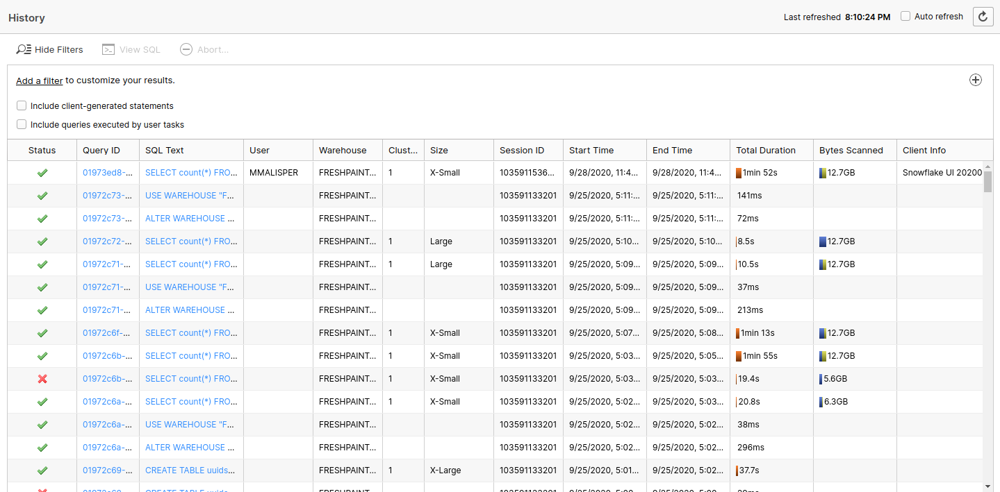 This is great for any number of purposes. If you edit a SQL query and forgot the exact query you ran, you can easily find the query in the Snowflake history. You can use this data for auditing and see what queries everyone ran against your data. You can also use it to optimize your performance spend by seeing what queries are consuming the most compute time.