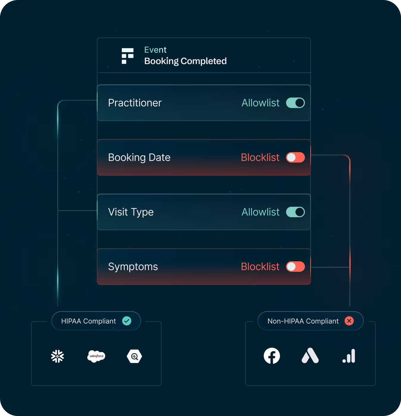 Define exactly which data points flow to which platforms at the event level. Create custom allowlists and blocklists that automatically filter PHI before it reaches third-party tools. No more relying on developers to remember rules or hoping marketing doesn't accidentally expose sensitive data. Freshpaint enforces governance automatically, so compliance doesn't depend on human memory or manual processes.
